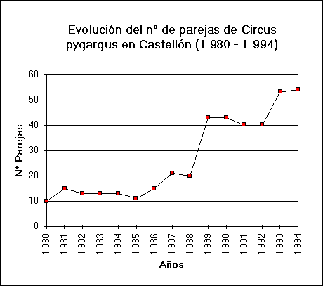 Número de parejas y parámetros reproductivos: En la provincia de Alicante las parejas nidificantes nunca han sido abundantes ( 8 parejas a mediados de 1.970), 3-4 parejas entre 1.985-87 (Urios, V. et al, 1.991), observándose un aumento a partir de la década de los noventa, 11 parejas en 1.992 (Sánchez, J. A. , et al, 1.992), 13-14 parejas en 1.993 (Sánchez, J.A. com. pers.), 10-12 parejas en 1.994 (Rico, L. com. pers.).En la provincia de Castellón el número de parejas nidificantes sigue un lento pero progresivo aumento (gráfico 1), observado desde 1.986, situandose en la actualidad por encima de las 50 parejas.