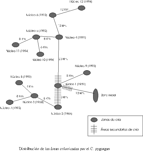 Este aumento del número de parejas nidificantes esta ligado a un proceso de expansión en el interior provincial (mapa II), permaneciendo más o menos estable en la zona litoral aunque de unos años a otros aparecen incrementos o disminuciones importantes que deberían ser objeto de estudios más profundos. Pasando de 1 núcleo de cría a 12 en la actualidad.