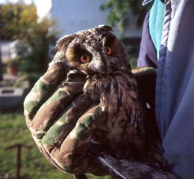 | Foto .- Lechuza común capturada en parany. Termino Els Ibarsos |