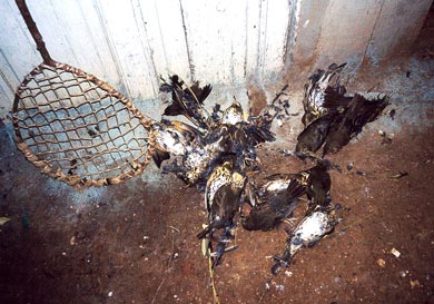 Foto.- Especies protegidas muertas atrapadas en parany aún con las varetas pegadas al plumaje. |