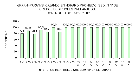 Otro aspecto a considerar es que el número de paranys preparados en horario prohibido (de las 11 a las 17 h.), va en función del número de grupos que forman el parany así, aunque prácticamente todos los paranys están preparados durante todo el día y la noche, es a partir de los 6 grupos de árboles que el 100% están cazando (Graf.4). Ello creemos que es debido al trabajo que representa el parar (montaje de las varetas en las perchas) y disparar (retirar las varetas), es tan enorme que el paranyero prefiere tenerlo todo el día con las varetas impregnadas de liga y durante varios días seguidos, y limitarse solamente a reparar (colocar nuevas varetas donde falten: por que han caído por el viento o las llevan las aves pegadas a su plumaje). Se observa que los paranys compuestos con un solo grupo de árboles son los que con mayor frecuencia se mantienen sin estar preparados para cazar en horario prohibido, debido a que es poco el tiempo y trabajo que representa.