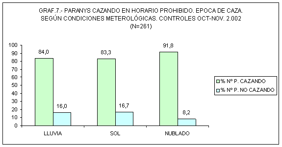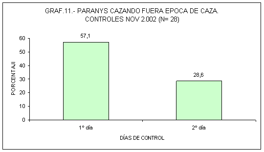 Se han analizado día por día de control de los paranys en el área de estudio, para ver si existían algunos días en los que los cazadores se ajustaban más a las normas de la legislación vigente, pero 11 de los 12 días de seguimiento en época de caza y de lunes a domingo (Graf. 8), el número de paranys cazando en horario prohibido resulto ser muy alto, por encima del 80 % de todos los paranys analizados, por lo que vuelve a reafirmar nuestra hipótesis en la que en los paranys siguen cazando durante todo el día todos los días de la semana.