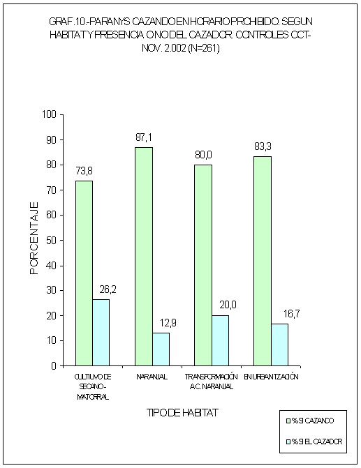 En los cuatro tipos de hábitats analizados, tampoco se encuentran diferencias destacables, situándose prácticamente en todos los lugares alrededor del 80 % los paranys que siguen cazando en horario prohibido (Graf.10), uniéndose al mismo tiempo la gran ausencia del cazador mientras el parany sigue capturando aves.