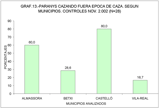 Los municipios analizados durante estos dos días y fuera de la época de caza han sido los de la zona costera: Vila-real, Almassora, Betxí y Castelló (Graf.13), siendo el municipio de Castellón y concretamente la parte sudeste del mismo el que con mayor frecuencia se han visto paranys cazando (80 %).