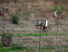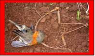 Cazador en la comarca de la Plana Alta. Petirrojo muerto con cepo en la Plana Baixa